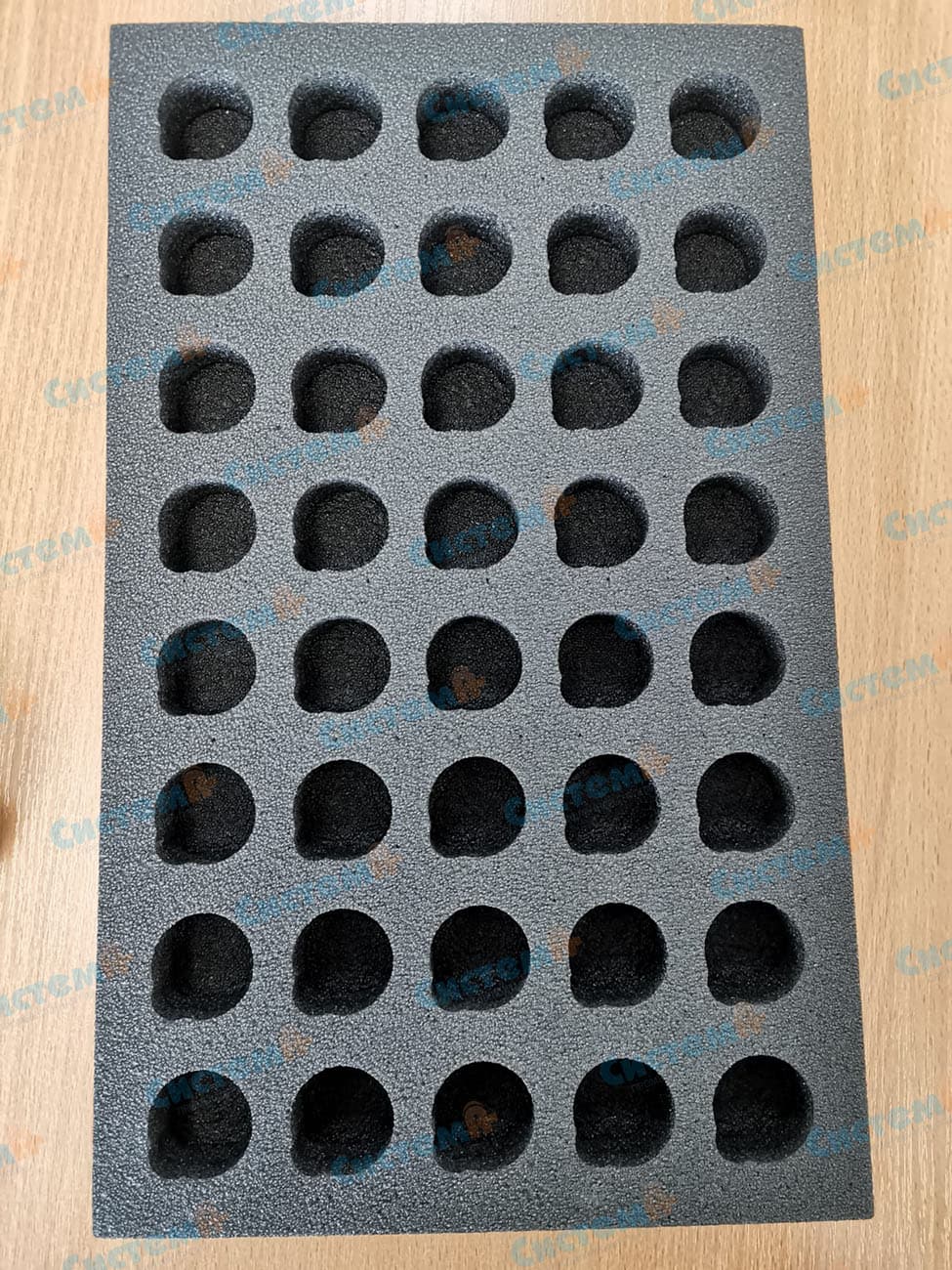 Поэтому для этого проекта было принято решение изготовить вкладыши полностью из ХС-ППЭ. Мы изготовили тестовый образец и отправили его заказчикам. После тестирования на производстве, клиенты решили изменить размер ложемента, так как решили укладывать эти ложементы в ящики с определенными размерами. Также нас попросили увеличить отверстия для деталей на 5мм для удобства извлечения. Также мы увеличили количество отверстий в ложементе, чтобы как можно эффективнее использовать его площадь.